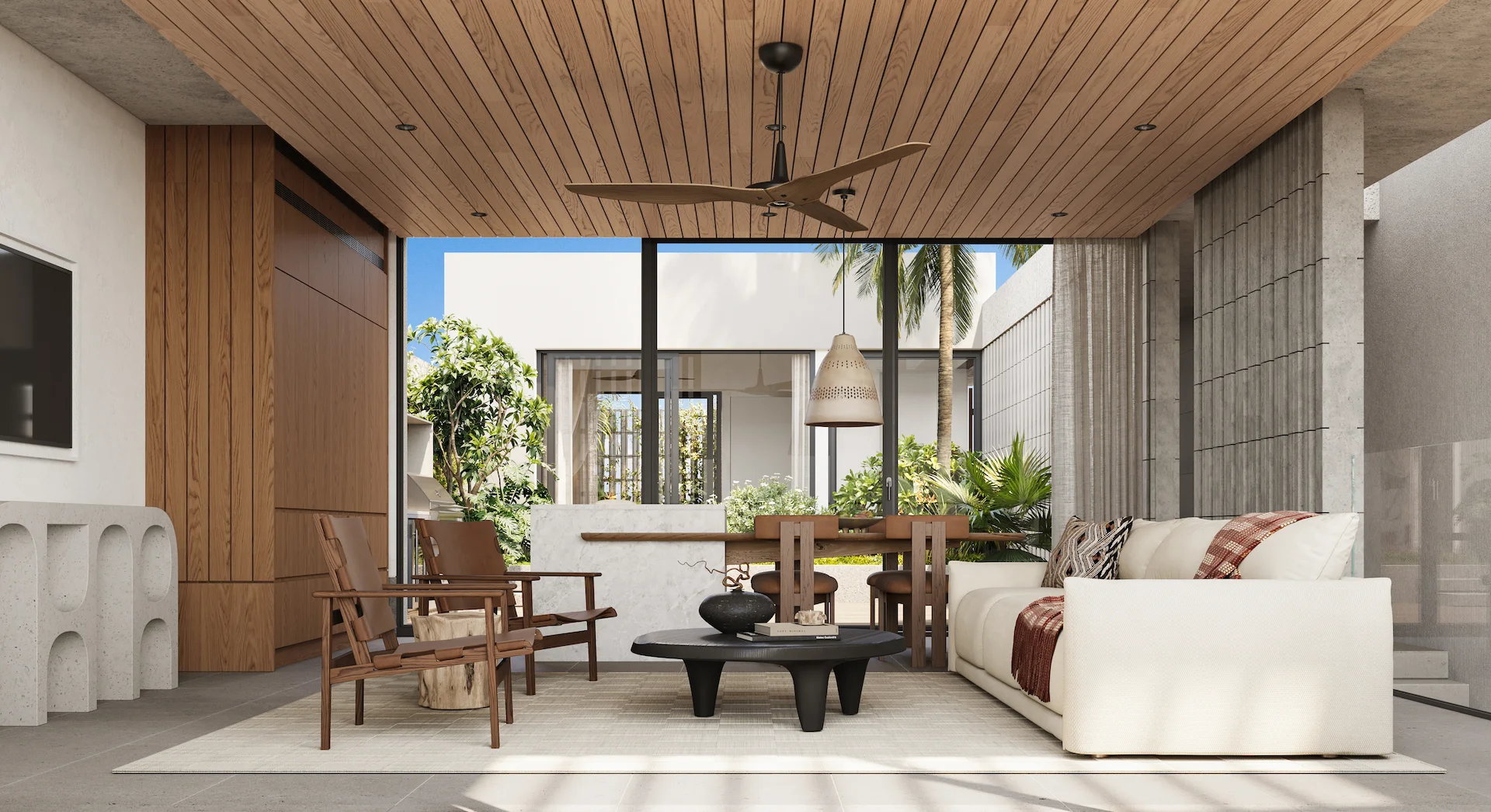 Each piece of furniture within the interiors was custom-modelled by hand from designer references and brand catalogues, because the locally sourced elements defining the project’s aesthetic, woven straw lamps, carved dark timber, coral stone textures, simply do not exist as off-the-shelf digital assets.